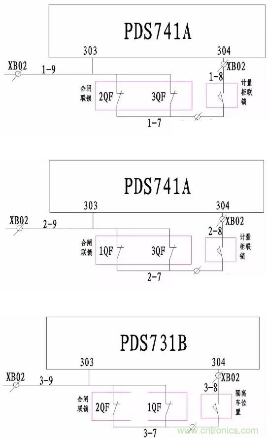 在计量柜与母联隔离柜都到位的情况下,合1QF与2QF。这时PDS731B的3-7与3-9处于分断的状态,其304端子无电源,3QF不满足合闸条件。同理,1QF与3QF合闸时,2QF不满足合闸条件;2QF与3QF合闸时,1QF不满足合闸条件。
