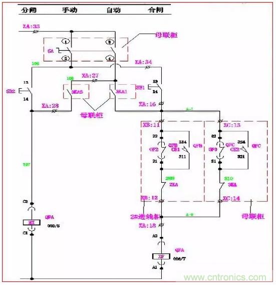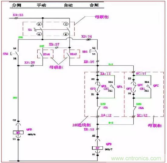 手动时:当QFA、QFB合闸,QFC合闸回路C-1、C-2断开,其合闸线圈XF无法得电, QFC不能满足合闸条件;同理,当QFA、QFC或QFB、QFC同时合闸时,QFB或QFA也同样不能满足合闸条件。使进线柜与母联满足“三合二”逻辑。