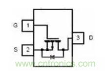 仔细看看你会发现,这两个图似乎有差别,对了,这实际上是两种不同的增强型场效应管,第一个那个叫N沟道增强型场效应管,第二个那个叫P沟道增强型场效应管,它们的的作用是刚好相反的。前面说过,场效应管是用电控制的开关,那么我们就先讲一下怎么使用它来当开关的,从图中我们可以看到它也像三极管一样有三个脚,这三个脚分别叫做栅极(G)、源极(S)和漏极(D),mpn中的贴片元件示意图是这个样子: