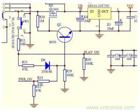 图中电池的正电通过开关S1接到场效应管Q1的2脚源极,由于Q1是一个P沟道管,它的1脚栅极通过R20电阻提供一个正电位电压,所以不能通电,电压不能继续通过,3v稳压IC输入脚得不到电压所以就不能工作不开机!这时,如果我们按下SW1开机按键时,正电通过按键、R11、R23、D4加到三极管Q2的基极,三极管Q2的基极得到一个正电位,三极管导通(前面讲到三极管的时候已经讲过),由于三极管的发射极直接接地,三极管Q2导通就相当于Q1的栅极直接接地,加在它上面的通过R20电阻的电压就直接入了地,Q1的栅极就从高电位变为低电位,Q1导通电就从Q1同过加到3v稳压IC的输入脚,3v稳压IC就是那个U1输出3v的工作电压vcc供给主控,主控通过复位清0,读取固件程序检测等一系列动作,输处一个控制电压到PWR_ON再通过R24、R13分压送到Q2的基极,保持Q2一直处于导通状态,即使你松开开机键断开Q1的基极电压,这时候有主控送来的控制电压保持着,Q2也就一直能够处于导通状态,Q1就能源源不断的给3v稳压IC提供工作电压!SW1还同时通过R11、R30两个电阻的分压,给主控PLAY ON脚送去时间长短、次数不同的控制信号,主控通过固件鉴别是播放、暂停、开机、关机而输出不同的结果给相应的控制点,以达到不同的工作状态!