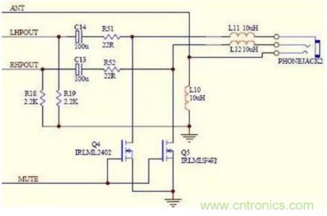 上图是一个有主控控制耳机有没有声音输出的电路图,声音的左右声道分别通过隔直流电容C13、C14和电阻R51、R52送到耳机孔,但是在电阻R51、R52和耳机孔之间却接入了一个N沟道的mos场效应管,这个场效应管的栅极连接在一起受着MUTE的控制,当MUTE的地方处于高电位时候,Q4、Q5导通,就会把声音通过Q4、Q5入地,耳机里就不会有声音了,当MUTE的地方处于低电位时候,Q4、Q5关断,声音就只有通过耳机而发出声音了!