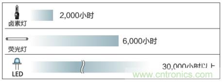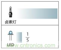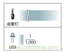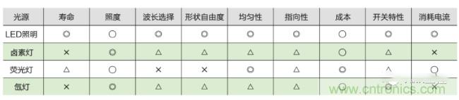 其中卤素灯、荧光灯、氙灯都是我们常见的光源类型,卤素灯又是这些里最常见的。那我们就看一下LED对比卤素灯的:
