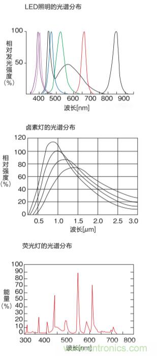 当然就算你的响应速度再快、消耗电流更小、寿命更长但如果光谱分布不好也是有问题的,所以下面我们看一下LED的颜色光谱分布情况。首先要说明LED照明的光谱分布不像荧光灯、卤素灯那样波长分布较宽,每个LED照明发光波长可谓某个固定的特定波长。