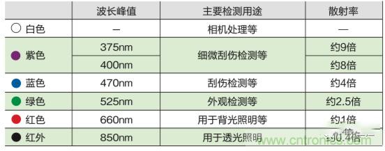 比红光的散射率作为基准单位,各波长相对于红光的散射率比值。波长越短散射率越高。使用散射率较高的波长时,便于捕获检测物体表面的散射光,有效检测散射光反映出的表面特征。反之,波长变长时透光率也随着增大,特别是红外光照明,常用于背光光源检测透过检测物体的折射光。
