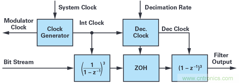 传统的三阶sinc滤波器如图1所示。滤波器通过按比例缩放系统时钟来生成ADC的调制器时钟,而ADC则向滤波器返回一个1位数据流。滤波器功能本身包括三阶级联积分器 1/(1 – z–1)(时钟速率与调制器速率相同)和三阶级联微分器 1 – z–1(时钟速率为抽取时钟)。