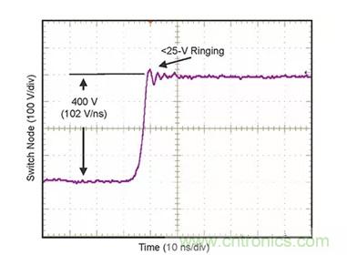 该芯片的压摆率可达 100 伏/纳秒 (ns) 且瞬时振荡近乎为零(图 3)。相比之下,传统硅功率 MOSFET 的压摆率典型值为 3 至10 V/ns。