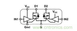 图5:EPC 的 eGaN 集成驱动器 IC 包含两个功率晶体管,各配有相应的优化型栅极驱动器。(图片来源:EPC)