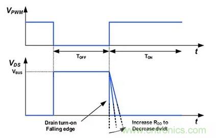 图6:RDD 电阻器的大小决定了 NV6113 导通电流和功率 FET 漏极的导通(下降)沿压摆率。(图片来源:Navitas Semiconductor)