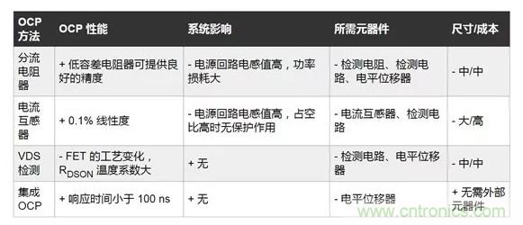 一种传统的 OCP 方法是使用电流互感器、分流电阻器或去饱和检测电路(如下表)。然而,这会增大电源回路的寄生电感和电阻,反而需要降低压摆率,且导致功率耗散升高,从而对系统性能产生不利影响。此外,互感器或分流电阻器等分立器件会增加成本,占用电路板空间。