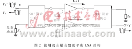 通常,在LNA的设计中主要考虑低噪声系数(NF)。足够的增益(G)和绝对的稳定性?对于本文TMA放大器中LNA设计的实际技术规范要求如表1所示。同时要求所使用的LNA结构满足良好的输入输出匹配,保证LNA的稳定性,兼顾到功分/合路网络的低损耗、几何尺寸小,工作带宽内良好的相位和幅度匹配,足够的工作带宽(涵盖在1.95GHz左右),符合CDMA标准上行频率?据此选择了以平衡结构为特征的LNA结构(如图2)。这种平衡结构的重要特性是:它较单阶放大器的截点高出一倍,并以标准50Ω实现输入输出匹配,在某一路硬件失效时电路的冗余设计可保证系统的正常运行。但通常增益减少6dB。