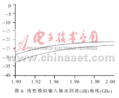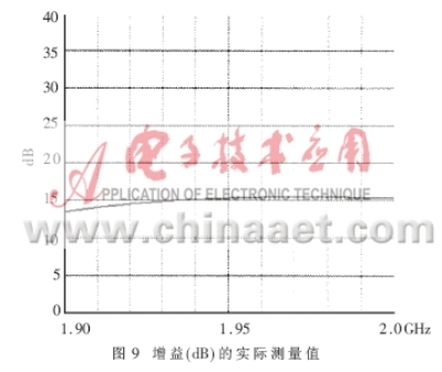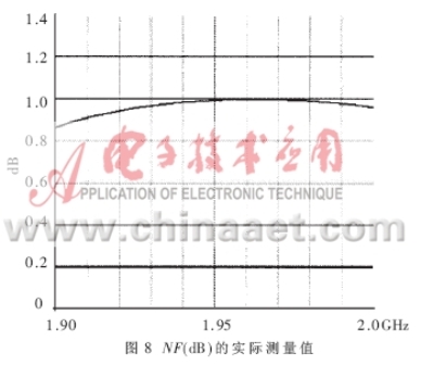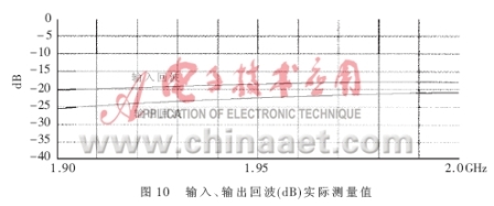 得到了完整的电路PCB板后,就要实际测量电路的各个参数,验证设计的仿真结果是否与之相符,是否最终符合表1的设计技术规范。本文所采用的测试仪器是HP8753ES网络分析仪和HP8970B噪声仪。图8、图9表达出放大器实测的NF和增益曲线,在带宽为0.1GHz的频率范围内NF的值在0.8dB和1.0dB之间,增益在1.97GHz达到最大值15.5dB,在1.99GHz达到了15.3dB。由于NF是在实际PCB板外腔体内测得的,包含了同轴连接器的损耗和二级噪声损耗,其测量指标表明实际的电路NF特性要稍差于模拟特性。图10是输入、输出的回波曲线。当频点在1.96GHz时,输入回波为18dB,输出回波达到22.5dB,放大器的OIP3在直流偏置Vds=3V,Id=60mA时测得值为37dBm,P1dB为21.4dBm。电路在较低的偏置状态下Vds=3V,Id=40mA放大器的NF和增益都没有降低,只有OIP3测出下降为36.5dBm。