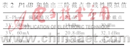 对于非线性模拟,常以谐波平衡模拟(HB)来实现。非线性模拟方法HB计算速度快,能够处理分布元件和分立元件的电路,并很容易与更高阶谐波及互调元件相容。ATF-54143管的P1dB和OIP3模拟非线性模型是基于W.R.Curtice模型,这个模型可以非常近似地模拟直流和小信号工作状态(包括噪声),对于截点的模拟则做出模拟预测结果比实际值要偏低。P1dB和OIP3的值如表2 所示:当平衡LNA放大器的OIP3模拟结果为32.1dBm时,P1dB则为20.8dBm,P1dB的模拟结果与实际的测量结果很接近,而OIP3的模拟结果则偏低,实际的测量结果达到37dBm。