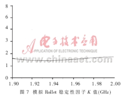 除了能够得出增益、NF、P1dB和输入输出回波等重要参数外,软件模拟还能够得出关于电路设计稳定性的信息。它是电路能否正常工作的重要前提。模拟软件计算Rollet稳定性因子K和作稳定性圆是两种很容易做到的方法,它们可以明确地表示出稳定性的数据。图7示出的Rollett稳定因子K的模拟值(K>1)表明:在1.9~2.0GHz工作带宽范围,电路能够实现无条件稳定。