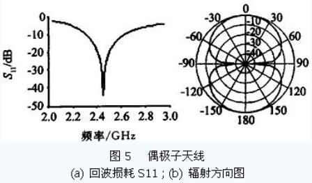 当单个振子臂的长度l =λ/ 4 时(半波振子) ,输入阻抗的电抗分量为零,天线输入阻抗可视为一个纯电阻. 在忽略天线粗细的横向影响下,简单的偶极子天线设计可以取振子的长度l 为λ/ 4 的整数倍,如工作频率为2. 45 GHz 的半波偶极子天线,其长度约为6 cm.当要求偶极子天线有较大的输入阻抗时,可采用图4b的折合振子.