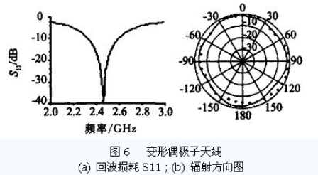 从图5b 可以看到在天线轴方向上,天线几乎无辐射. 如果此时读写器处于该方向上,应答器将不会做出任何反应. 为了获得全方位辐射的天线以克服该缺点,可以对天线做适当的变形,如在将偶极子天线臂末端垂直方向上延长λ/ 4 成图4c 所示. 这样天线总长度修改为(57. 0 mm + 2 ×28. 5 mm) ,天线臂宽仍然为1 mm. 天线臂延长λ/ 4 后,整个天线谐振于1 个波长,而非原来的半个波长. 这就使得天线的输入阻抗大大地增加,仿真计算结果约为2 kΩ. 其输入回波损耗S11如图6a 所示. 图6b 为E 面(天线平面) 上的辐射场方向图,其中实线为仿真结果,黑点为实际样品测量数据,两者结果较为吻合说明了该设计是正确的. 从图6b 可以看到在原来弱辐射的方向上得到了很大的改善,其辐射已经近似为全方向的了. 电压驻波比(VSWR) 小于2. 0 时的阻抗带宽为12.2 % ,增益为1.4 ,对于大部分RFID 应用系统,该偶极子天线可以满足要求.