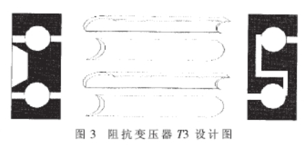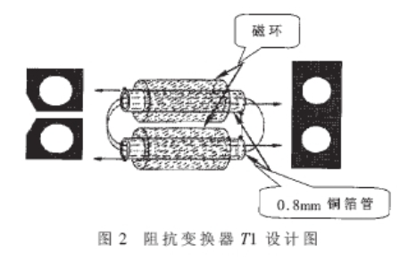 图2中深色区域代表覆铜区域。铜箔管首先穿过磁环后再穿过两端的铜膜板并焊接在一起,完成次级线圈。T2的设计基本与T1相似,只是使用同轴线SFF-1.5-1的芯线缠绕的初级线圈圈数不同而已。