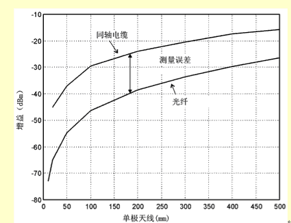 一般地讲,我们不知道发射元件的效率和放大器的增益分别是多大(至少不能通过测量得到,但可以通过模拟或者模型分析得到这些数据)。相反,G/T损失是直接通过测量天线的输出噪声总功率得到的,这时天线是放在一个特殊的环境中(例如在消声室中,Ta=T0),增益是用增益置换法借助一个增益已知的参照天线通过测量得到的。但是要小心。要通过标定把测量设备产生的噪声去掉,在测量时没有金属物体(同轴电缆线或者电源线)和它相连。由于这个原因,莱尔德科技公司研制了一种代替电缆线的系统,它利用了光纤的原理,连同一个用电池供电的前置放大器,这些在一起可以妥善地测定小天线的电气特性(见图1)。估计同轴电缆线引入的测量误差的设置如图2所示。图2中,在单极天线从基板上伸出来的长度不同的情况下,用同轴电缆线和光纤系统测量了它们的增益。可以看到,在长度为10mm左右(这是内置天线的实际长度)时,测量误差超过20dB。