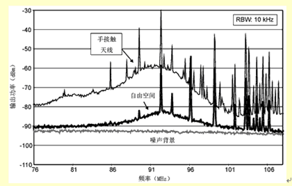最后,要注意人体对小天线在FM调频频带的增益的影响是正面的,尤其是使用者的身体与天线或者底板接触的情况下。这是因为,在100MHz左右,人体是效率相当好的天线,半波长是1.5m左右。图3给出了人体接触天线和没有接触天线时,接收天线的输出频谱。很明显,用手接触天线时,G/T提高了10~15dB。由于大多数使用者在听电话时和移动电话是靠得很近的,所以可以合理地假定,FM调频天线的实际性能优于它处在自由空间时的性能。