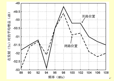 在发射时,发射元件起标准的无源天线作用,它用一个单刀单掷(SPST)通断控制进行连接(见图4)。前置放大器处在Rx状态,仍然与天线连接(但是切断电源)。用一个内阻为50Ω的信号源供给信号时,失配的半圈天线的增益测定值如图7所示。宽带范围的平均增益(或者效率)达到-53~-49dB。在开关和调频发射组件之间接入一个匹配网络,或者选择适当的功放输出阻抗,那么对输出功率的要求可以放宽很多。