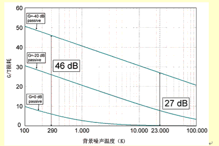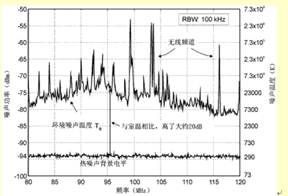 噪声电平升高表示有源器件和电阻器产生的噪声影响减少了。除非是内置天线,其发射元件的增益很低,一般情况下,天线的实际温度支配着噪声温度。而且,噪声背景强表示,在低噪声的理想情况下,可以降低对发射元件的要求,并不会明显地降低G/T。这点可以定性地这样理解:效率高的天线接收到的信号大于效率低的天线接收到的信号,但是它接收到的噪声也比较大。因此,在天线输出端的信噪比并没有好一些。第二点是接收器的噪声指数NFrec也增加了天线输出的噪声,但是只要放大器的增益相当大(即Gamp>NFrec),它的影响就很小,与无源天线相比,这就提高了系统的性能(从噪声背景方面讲)。要注意的一点是,这两方面(也就是背景噪声和NFrec)的作用一般是分不开的。例如,背景噪声温度高时,接收器的噪声指数起的作用就小,反过来也是这样。