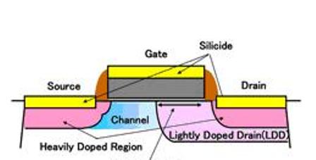 1.“低掺杂漏极”(LDD)区包围该晶体管的漏极,并与门极重叠。这一结构既能降低水平扩展至漏极的电场,也能降低垂直扩展至门极氧气层的电场,从而增加了击穿电压。