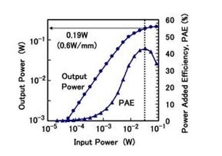 富士通通过使用45nm工艺技术把新型晶体管技术应用到3.3 V I/O的标准晶体管上,从而开发出了世界上首个能把击穿电压从6 V 提高到 10 V的晶体管。新型晶体管适用于功率放大器,它在最大振荡频率为43 GHz (图2)时每个1mm门极宽度能够输出0.6 W(0.6 W/mm),展示了其作为功率放大器在面向WiMAX等高频应用方面的卓越性能。新型晶体管在基本的可靠性测试上也取得了良好的测试结果。