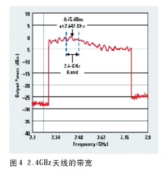 确定天线带宽的两种常见方法是:1)在相关频带上调节载波的同时对辐射功率进行测量;2)使用网络分析仪对天线馈电点的反射进行测量。图4显示了第一种方法,其对一个2.4GHz 天线的辐射功率进行测量,这种天线在2.4GHz频带上具有接近2dB的输出功率变化,同时还具有接近于这一频带中心的最大辐射。这种测量方法是通过对2.3~2.8GHz的连续波信号进行调节来完成的。这类方法应该在一个无回音室中进行,以获得正确的绝对带宽级别。然而,即使在没有无回音室的情况下,这种方法也非常有用。