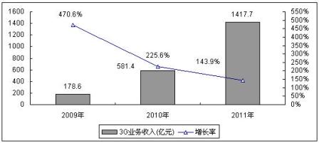 图2 2009-2011年中国3G业务收入规模与增长预测