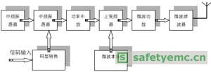 中频调制发射机的方框图如图2所示。信码经过码型变换后,在中频调制器中进行调制,获得中频调制信号,然后经过功率中放,把这个己调信号放大到上变频器要求的功率电平。上变频器把它变换为微波调制信号,再经微波功率放大器放大到所需的输出功率电平,最后经微波滤波器输出馈送到天线,由发射天线将信号送出。