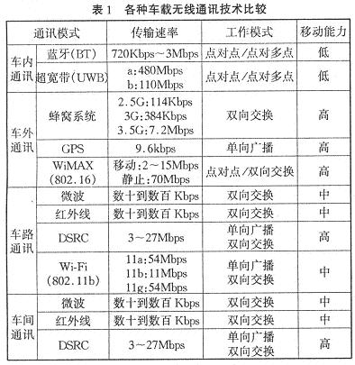 表1列出了四种模式下各种车载无线通讯技术的比较。