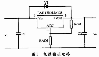 需要说明的是,图1中的稳压器管脚电压差Vo-Vi应在3-35V范围内,超出范围将不稳压;LMll7K的额定电流为1.5A,LMl38K的额定电流为5A;这两个器件的两者管脚定义相同;为保证稳压器正常工作,设计时可选用0.25W电阻ROUT,其值可选120Ω~240Ω。