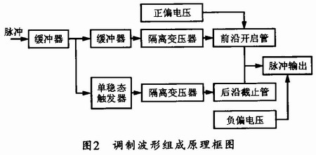 本调制器的组成原理框图如图2所示。图中,当定时脉冲输入到来时,经过缓冲器驱动后,该脉冲将分成两路,分别提供给调制脉冲前沿开启和后沿截止MOS管。其中前沿开启脉冲经缓冲器驱动和三极管放大后,加到隔离升压变压器,以保证高速开启管正???;而后沿截止脉冲则使用后沿触发的单稳态触发电路形成,以保证形成的调制脉冲的宽度与定时脉冲的宽度一致。