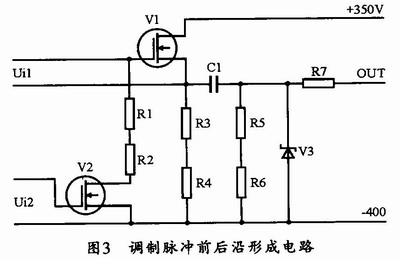 本调制器的调制脉冲前后沿形成使用的是BUZ50B,当Ui2使得V2导通时,负偏电压将使V1迅速截止。这样形成的调制脉冲就能够具有非常良好的后沿波形。其电路图如图3所示。