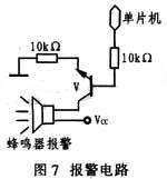 显示电路采用4位共阳LED数码管,码段由74LS244驱动电路驱动;驱动电路由PNP晶体管8550驱动。图7给出报警电路。它采用晶体管驱动。