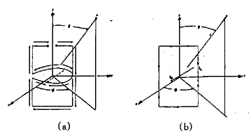 如图2(a)所示。此处我们选择螺旋中心为原点,螺旋轴为Z轴,顶面和底面上天线臂的平行线为Y轴来建立坐标系,另外柱面上的螺旋部分近似用直线和半圆的组合来代替,图中的实箭头表示电流方向,虚箭头表示圆上电流的矢量和。显然该模型可更进一步简化为图2(b)所示的一个YZ平面上的电流环和一个X轴上的电偶极子的组合。同样跟它垂直的另一付双臂螺旋天线亦可等效成一个XZ平面上的电流环和一个Y轴上的电偶极子的组合。根据天线的基本原理,由于这两组电流环和电偶极子互相垂直且相差90°,那么在远区得到的是一个宽波束的心脏形圆极化方向图。
