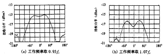 其中λC表示中心频率对应的波长。最后得到该天线的实测结果如图3、图4所示。图3(a)中的曲线1表示在HP8510B矢量网络分析仪上测得的四臂螺旋天线的驻波比特性曲线,为了便于比较,在同样条件下测得的八臂螺旋天线驻波比由曲线2给出,可见八臂螺旋能明显地展宽天线的频带;图3(b)表示在相同的仪器上测得的史密斯阻抗圆图。此处我们根据要求将天线的频带设计在14%,而事实上可以做得更宽。图4(a)和(b)分别为工作频率取0.93fc和1.07fc(即图3(a)中的标记2和3)时,由频谱仪测出的远区辐射方向图,它们的半功率宽度分别达到140°以及145°左右,这么宽的波束是其它形式的天线很难达到的。