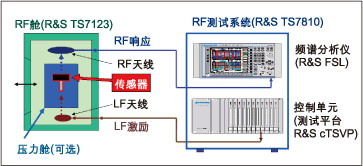 压力舱模拟RF测试舱内部的胎压。一个波形发生器以125kHz LF数据电报激励胎压传感器发送数据(ID号码、压力和温度)。该RF数据电报由测试舱中的ISM天线拾取并在频谱分析仪中解调。其系统软件可评估该信息并给出GO/NoGo信息。