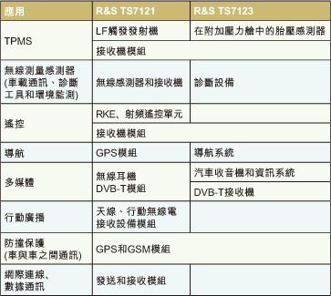 一些更新的应用包括用于确保轿车和卡车安全的胎压监测系统,以及可靠地实现电视接收的DVB-T接收机。在某些情形下,具备射频接口的诊断系统已经被安装在汽车维修中心和应急支援中心。其它应用还包括:用于监测发动机舱温度、压力和速度参数的传感器。