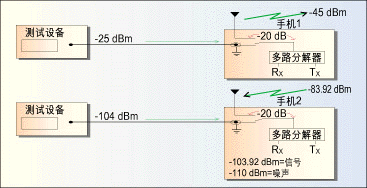 收器前端元件(下转换器和放大器)的噪声也会产生Nt,影响手机灵敏度,即正向链路功率测试级所达到的-104dBm规定灵敏度水平。另外其它所有噪声因素都会提高Nt,同时影响灵敏度测试的成功。与处于性能指标边缘的手机比较,具有一定容差的手机有更大空间容纳增加的噪声。