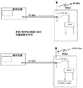假设在最坏情况下,手机1距离手机2 1米远(假定只有远场效应,近场因素很难考虑),将两个手机平行对准且手机之间没有衰减材料,则手机2的天线会收到一个高达-83.92dBm的信号。这样手机2的接收器就会有-103.92dBm干扰信号,因为假设天线到过电开关的衰减为20dB。这个例子说明了一个手机在另一手机接收信道上产生噪声的一般原因,根据例中所做假设,在实际执行中还有很多情况会引起不同的结果,这也为认识哪种噪声会从一个手机进入另一个手机信道提供了基础。方位、距离、开关衰减、屏蔽、天线设计和实现方式等,这些因素都会在引入噪声的整个转换中发挥作用。