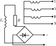 例如,在输出380V的三相四线制发电机组中,励磁线圈所需电压只要26伏左右就足够了。这个电压就是由3次谐波提供的。它是通过在发电机定子铁心槽中埋设的辅助绕组而产生的,再经桥式整流送给励磁电路。原理见图6,LF为谐波绕组,U、V、W、N为三相输出。