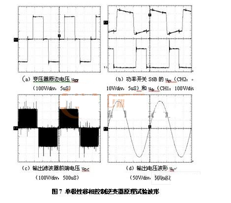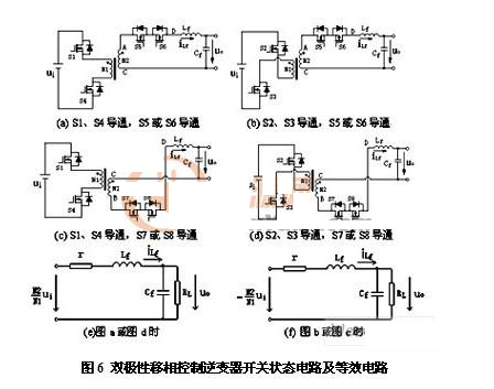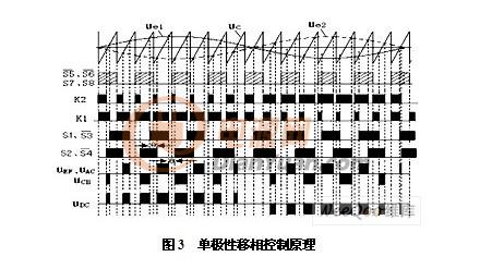 实现单极性移相控制的方案为:1、将输出电压反馈信号uof与正弦基准电压uref比较放大后得到电压误差放大信号ue1,ue1与载波uc比较后得到信号k1,k1下降沿二分频、反相互补后分别得到功率开关S1、S3的驱动信号;2、将ue1反极性信号ue2与载波uc比较后得到信号k2,k2下降沿二分频、反相互补后分别得到功率开关S2、S4的驱动信号;3、将载波uc下降沿二分频、反相互补后分别得到功率开关S5(S6)、S7(S8)的驱动信号。