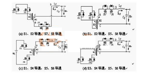 让周波变换器的功率开关S5与S7(S6与S8)之间存在换流重叠导通时间、S5与S6(S7与S8)按滤波电感电流iLf极性选择导通,从而使得该控制方案具有如下优点:1、周波变换器换流重叠期间实现了变压器漏感能量的自然换流,实现了功率器件的零电流开关;2、实现了滤波电感电流的自然续流;3、iLf极性选择信号的引入避免了换流重叠期间周波变换器中的环流现象;4、每个开关周期内两次交流侧的能量回馈实现了逆变桥所有功率器件的零电压开通[5]。