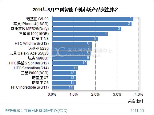 ZDC监测数据显示,2011年8月,中国智能手机市场上,诺基亚的用户关注比例为27.9%,尽管仍为最受用户关注的智能手机品牌,但与上月相比,其关注比例已经明显下降3.7%。诺基亚Symbian系统关注度的下降趋势已经无法遏制。