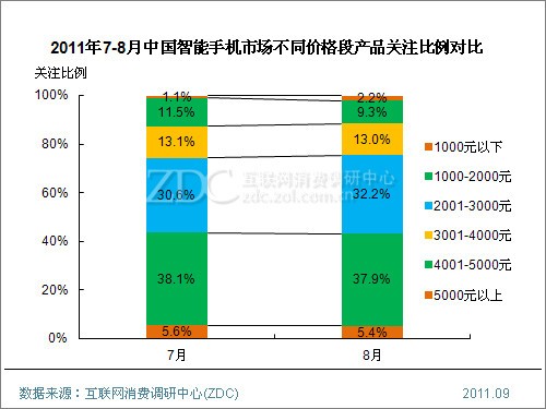 ZDC统计数据显示,2011年8月,在暑促效应影响下,诸多中高端智能机型价格下调,1000-3000元价格段智能手机用户关注度达到七成,较上月上升1.3%。3000元以上高端智能手机关注度则相应出现小幅下降。