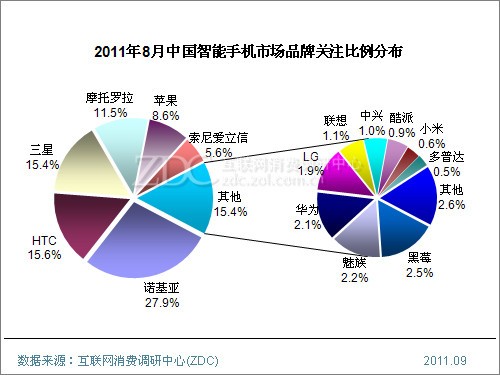 (图)2011年8月中国智能手机市场品牌关注比例分布