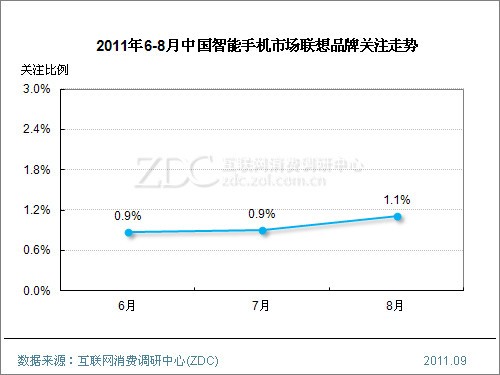 1、2011年6-8月中国智能手机市场联想品牌关注走势
