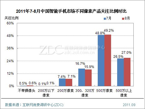 (图)2011年7-8月中国智能手机市场不同像素产品关注比例对比