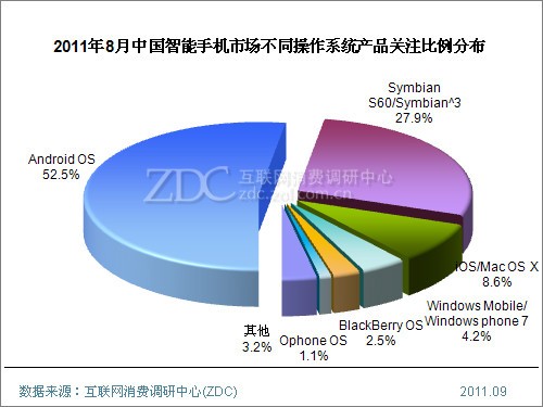 ZDC数据显示,2011年8月中国智能手机市场上,搭载Android操作系统的智能手机用户关注度已经达到52.5%,较上月再度攀升2个百分点。而诺基亚Symbian系统智能手机的关注度则持续下滑,本月跌破三成。其他操作系统产品关注比例变动幅度不大。
