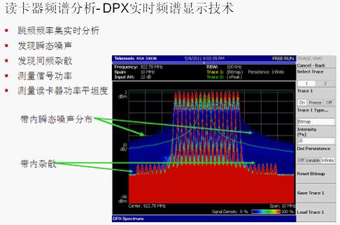 图4:泰克RTSA集成的DPX实时频谱显示技术非常适合RFID的读写器频谱分析。